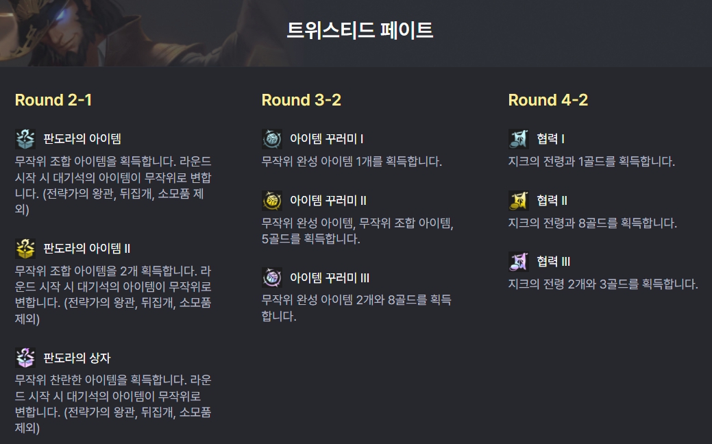 개인적으로는 트위스티드 페이트를 골라 초반에는 판도라의 아이템 증강을 뽑고, 이후 중간 단계에서는 리롤 관련 증강을 먹는 것이 빠르게 덱의 파워를 올릴 수 있다고 생각됩니다. 전투 관련 증강체인 회복의 구, 살인술사도 괜찮으며 조기 교육, 마력 집중, 적을 알라, 마법 지팡이, 완벽한 반복 등도 괜찮습니다.