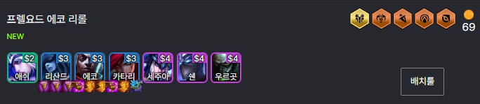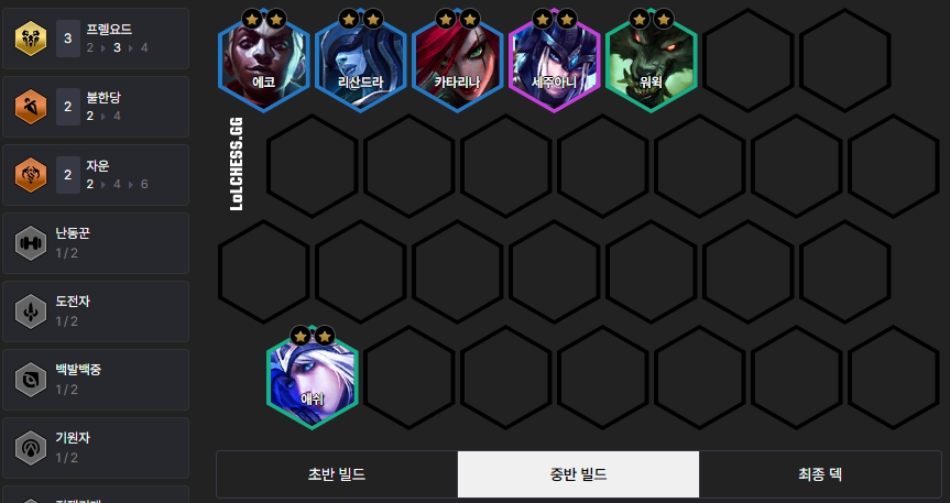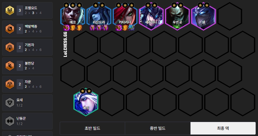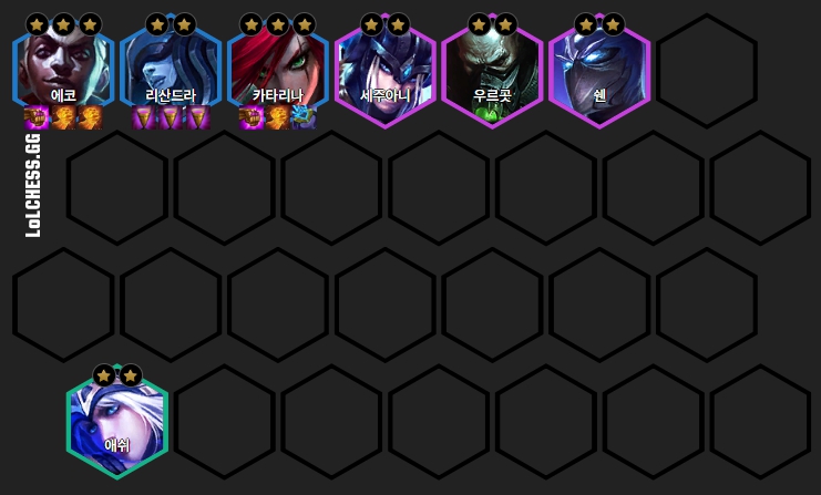 6렙 덱 구성입니다. 애쉬, 워윅, 리산드라, 카타리나, 에코, 세주아니로 이루어져 있습니다. 피관리가 되지 않는다면 6레벨에 리롤을 통해 에코, 카타리나를 2성작을 해준 뒤 7레벨을 올려줍니다.