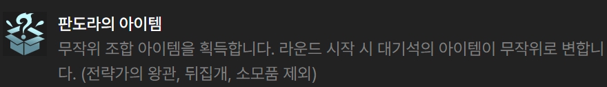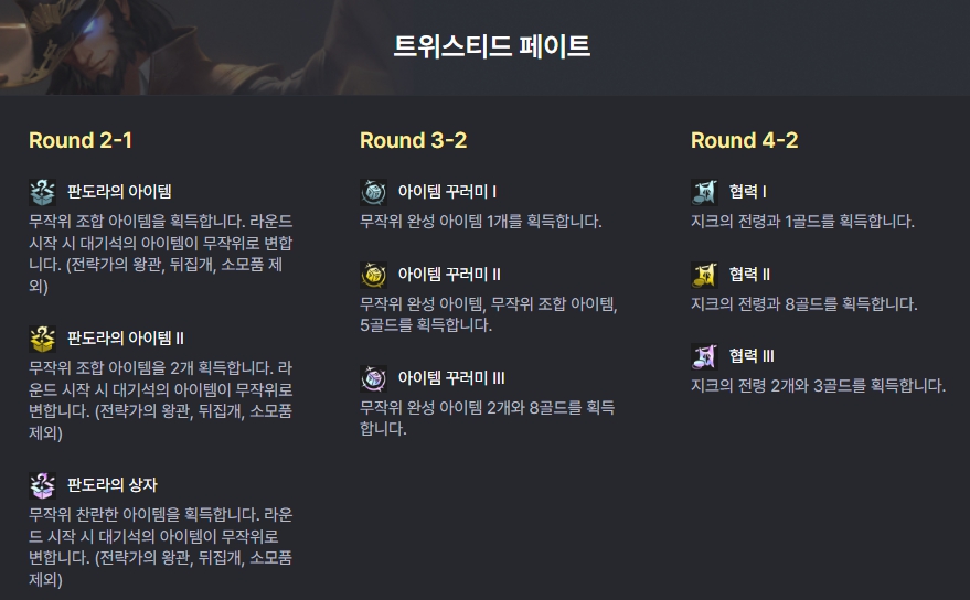 추천드리는 증강은 전투 관련 증강으로는 살인술사, 회복의 구, 불굴의 의지, 적을 알라 정도이며, 마법 지팡이도 괜찮습니다. 판도라의 아이템은 필수 증강이며, 그 외에는 프렐요드 심장, 프렐요드 영혼, 골드 티켓, 마법 지팡이 등을 추천드립니다.