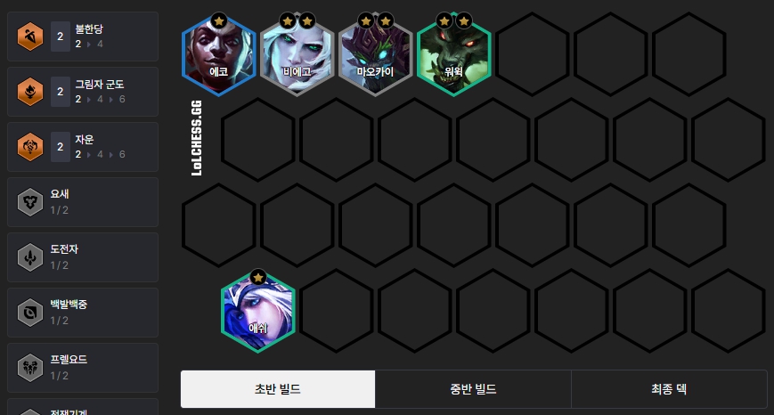 초반 5레벨에는 비에고, 마오카이, 워윅, 애쉬, 에코가 가장 좋습니다. 에코가 나오지 않았다면 이렐리아를 사용해 도전자(2)를 챙기거나 진을 사용해 백발백중(2)를 챙기면 됩니다.