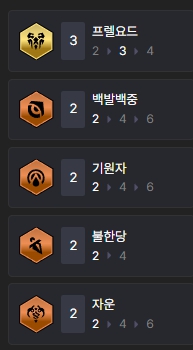 덱을 완성시켰을때 챙길 수 있는 특성은 프렐요드(3), 백발백중(2), 기원자(2), 불한당(2), 자운(2)입니다.