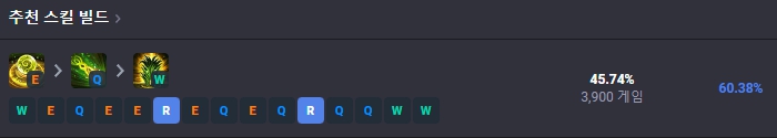 1레벨에는 W스킬, 2레벨에는 E스킬, 3레벨에는 Q스킬을 찍어준 뒤, 4레벨부터는 R-E-Q-W 순서로 스킬을 마스터해주시면 됩니다.