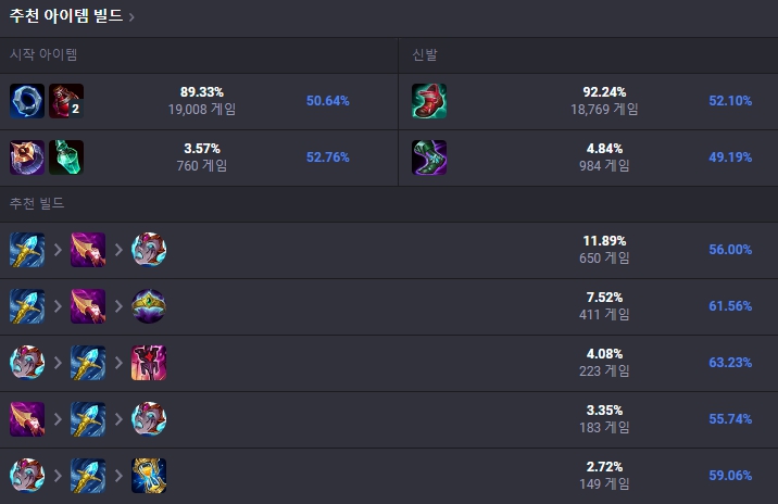 처음 시작 아이템은 도란의 반지와 포션 두개로 시작하며 첫 코어 아이템으로는 라일라이의 수정홀을 올려줍니다. 라일라이를 올린 뒤 신발은 아이오니아 신발, 이후에는 내셔의 이빨까지 고정으로 띄워줍니다. 이후에는 리안드리나 부서진 여왕의 왕관 등 상황에 맞게 유동적인 템트리를 올려줍니다.