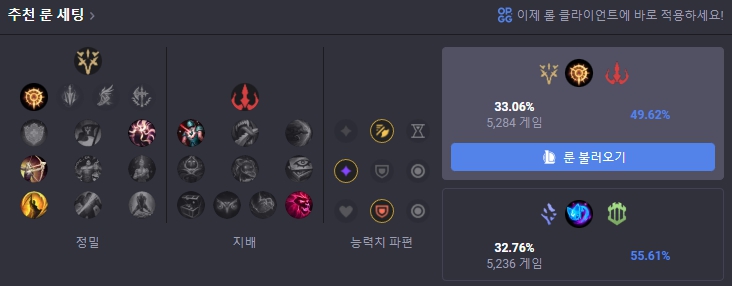 탑 아이번 룬은 정밀에서 집중 공격을 메인으로 사용하고 하위 룬으로는 침착, 전설: 민첩함, 최후의 일격을 들어줍니다. 보조룬으로는 지배에서 비열한 한 방과 궁극의 사냥꾼을 들어주고 능력치 파편으로는 공격 속도, 적응형 능력치, 상대 라이너에 따라 방어력 또는 마법 저항력을 들어줍니다.