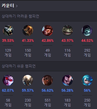 탑 아이번의 카운터 챔피언은 렝가, 아크샨, 오공, 탐켄치, 요릭으로 집계되었으며, 상대하기 쉬운 챔피언은 베인, 판테온, 크샨테, 야스오, 그웬으로 집계되었습니다.