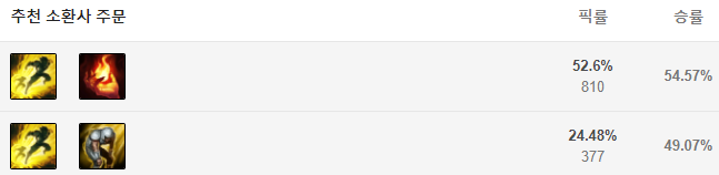 잔나의 스펠은 주로 점멸과 점화입니다. Q스킬과 W스킬, 평타를 적절히 섞어서 상대 원딜에게 잘 맞춰주면 은근히 딜이 쎄서 킬각이 자주 나오는데요, 그러한 킬각을 확실하게 잡기 위한 스펠인 점화를 자주 듭니다. 만약 상대팀에 암살자같이 한번에 폭딜을 넣는 챔피언 등이 있거나, 한번 물리면 거의 죽는게 확정인 챔피언이 있으면 탈진을 들어주는 것도 좋은 선택입니다.