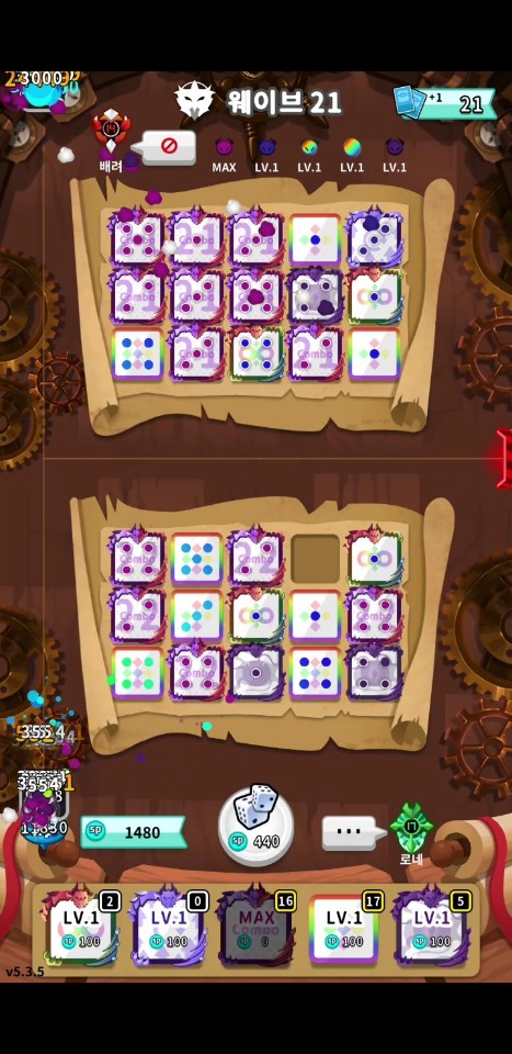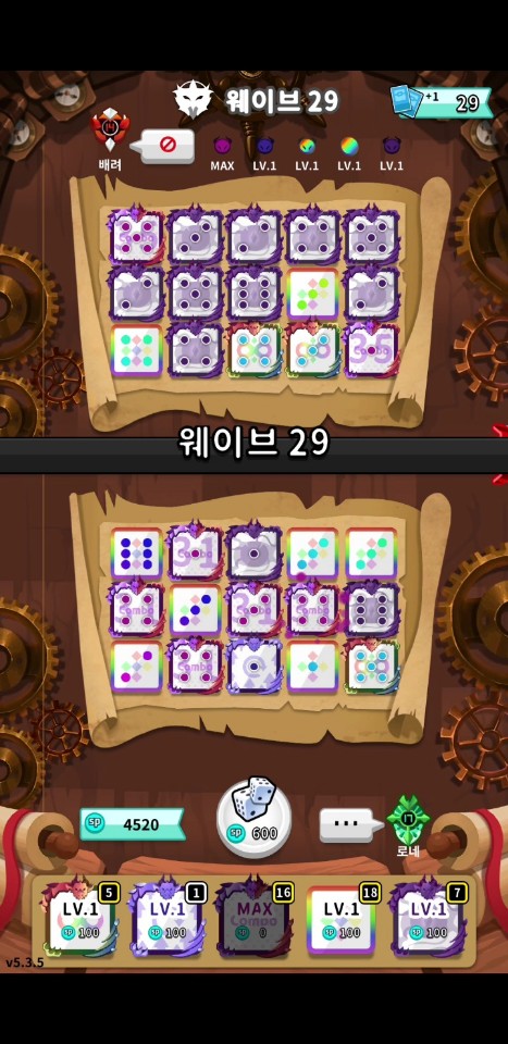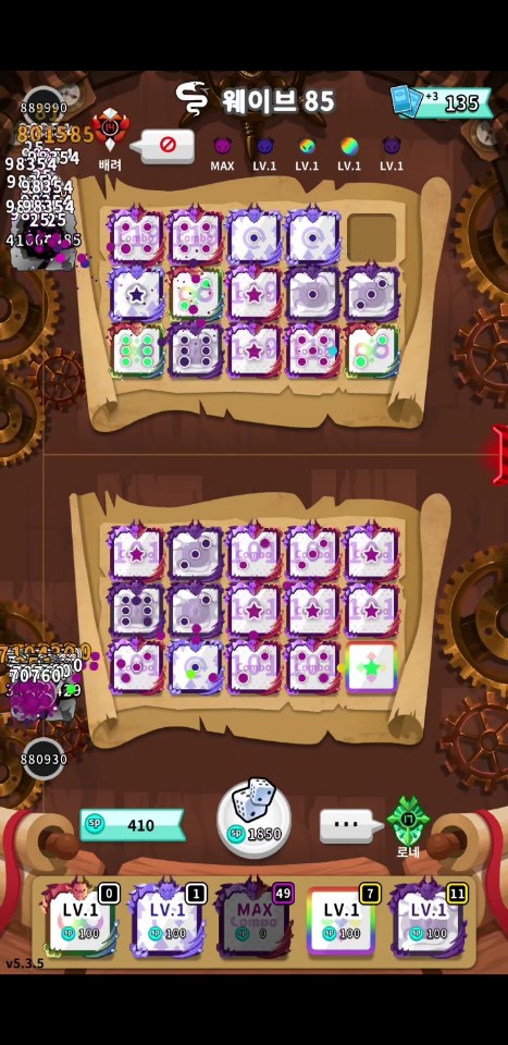 콤보를 쌓아가면서 참고해야 될 것은 콤보수도 콤보 수지만 필드에 있는 콤보 주사위의 숫자도 신경을 써야됩니다. 콤보가 굉장히 높아도 필드에 콤보 주사위가 별로 없다면 효율이 낮아지겠죠? 게다가 60탄 이후부터는 2라운드마다 보스가 한 번씩 나오는데 레온 보스의 경우 필드 주사위들의 눈금을 하나 낮추는 능력이 있고, 매지션의 경우엔 한 주사위를 파괴해버리니 갈수록 필드의 주사위들은 약해지겠죠.