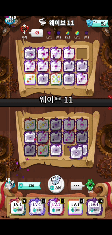 우선 1라운드부터 5라운드까지인 초반 부분입니다. 초반에는 주사위를 뽑아주시고, 콤보를 많이 쌓아주시는게 좋습니다. 일반적인 경우 조커 주사위를 콤보 주사위로 합치고, 적응 주사위와 콤보 주사위를 합쳐서 콤보를 늘리는데 주력을 해주는 것이 좋습니다. 또 나오는 전이 주사위는 최대한 그대로 냅두는 것이 좋은데요, 전이 주사위는 한 라운드가 끝날 때마다 더 많은 보너스 SP를 제공하기 때문에 모아두셨다가 11라운드 몬스터가 나오면 그때부터 쏴주는게 좋습니다. 다만, 5라운드에서 전복할 것 같다 싶으면 상황을 보고 4라운드에서 한 두개 정도 전이를 쏴주는 것도 좋은 방법입니다. 5라운드를 무사히 클리어했다면 전이 주사위는 모아주고, 콤보 주사위로 콤보를 쌓으면서 10라운드까지 진행하면 됩니다.