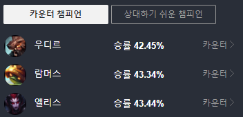 그 외에도 마이는 초반에 굉장히 강한 육식형 정글러가 아니기 때문에 항상 카정을 조심해야하고 우디르나 앨리스의 경우 마이에 비해 초반이 굉장히 강력하기에 카운터 챔피언이라고 할 수 있습니다.