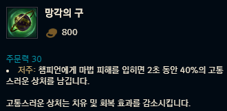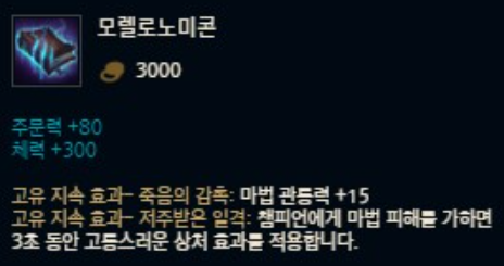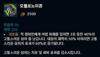 모렐로노미콘은 주문력 70과 체력 250을 올려주는 순수 스탯을 가지고 있습니다. 총 가격은 2,500골드로 850골드인 방출의 마법봉과 800골드로 가격이 하락한 망각의 구, 400골드인 루비 수정을 구입한 뒤 450골드를 더해 구입할 수 있습니다. 아이템 고유 효과로 괴로움이 있는데요, 이 효과는 적 챔피언에게 마법 피해를 입히면 2초 동안 40%의 고통스러운 상처를 남깁니다. 대상의 체력이 50% 이하라면 고통스러운 상처의 효과가 60%로 증가하는 효과입니다. 여기서 고통스러운 상처는 치유 및 회복 효과를 감소시키는 기능을 하죠.
