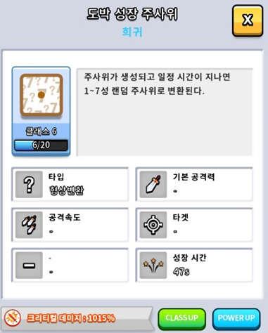 도박 성장 주사위는 주사위가 생성 되고 일정 시간이 지나면 1~7성 랜덤 주사위로 변환되는 주사위입니다. 예를 들어 1성 도박 성장 주사위를 뽑았다면 그 주사위는 일정 시간이 지난 뒤 자신이 들고 온 주사위들중 랜덤 주사위 1~7눈금으로 변환되는 것이죠. 완전 도박이라고 할 수 있습니다.