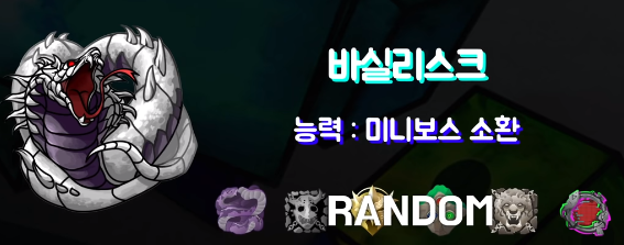 신규 보스는 바실리스크라는 보스로, 능력은 미니보스를 소환합니다. 미니보스는 바실리스크를 제외한 6마리의 보스 중 하나를 랜덤하게 소환하는데요, 여기서 소환된 미니보스는 기존 능력을 100% 발휘하고, 체력은 바실리스크 체력의 절반을 가지고 있습니다.