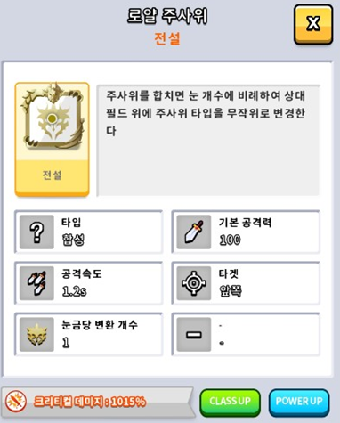 로얄 주사위는 주사위를 합치면 눈 개수에 비례하여 상대 필드 위 주사위 타입을 무작위로 변경합니다. 간단하게 보스 나이트의 변환 스킬이 눈금 개수에 비례하여 적용된다고 보면 되겠습니다.