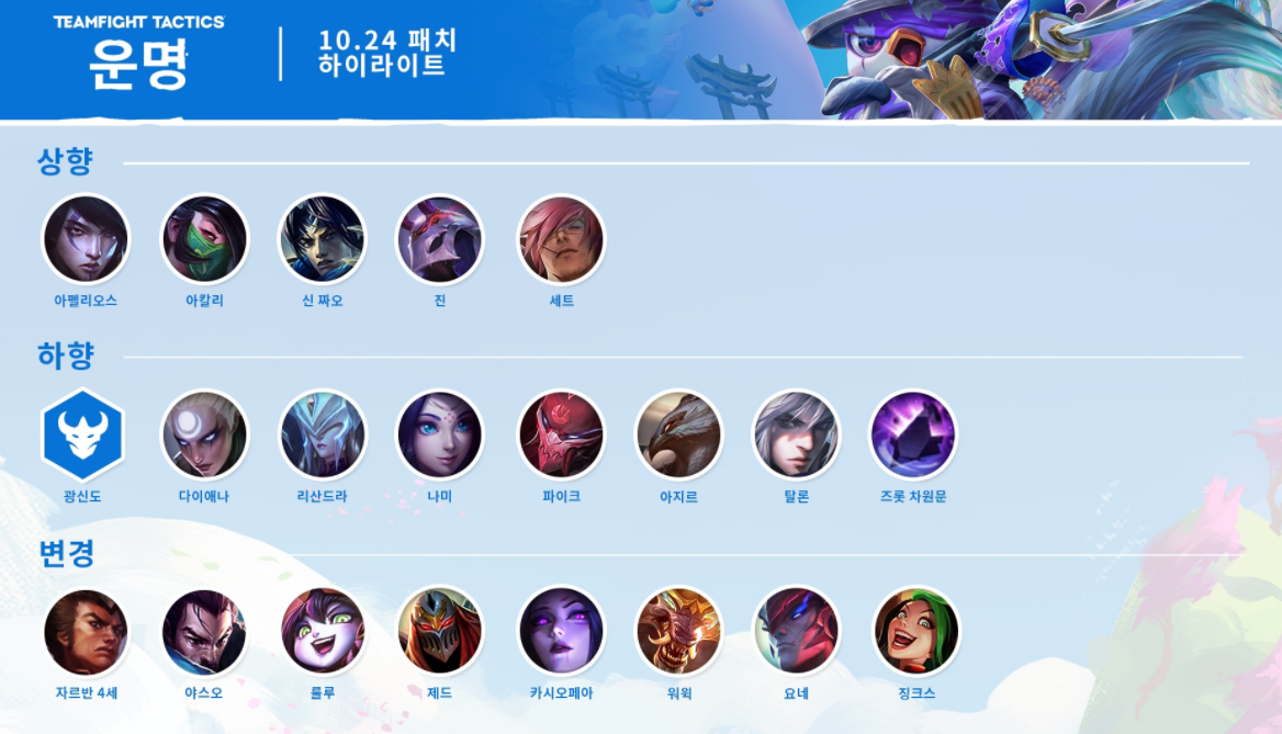 먼저 간단하게 패치 내역을 알아보면 5개의 챔피언이 상향, 그리고 한 개의 시너지, 한 개의 아이템 하향, 6개의 챔피언 하향, 8개의 챔피언이 수정 및 변경되었습니다. 지난 패치에서 아칼리가 너프를 먹었었는데, 다시 상향을 받았고 신짜오의 경우 상향을 받았었는데 이번 패치에서 한 번 더 상향을 받네요. 구체적인 부분들을 알아볼까요?