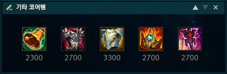 기타 코어 아이템으로는 미카엘의 축복, 가시 갑옷, 가고일 돌갑옷, 슈렐리아의 군가, 제국의 명령 아이템이 있습니다. 미카엘의 축복 같은 경우는 상대방 조합에 하드 CC기가 두 개 이상 있는 조합일때, 가시 갑옷은 상대 AD챔피언들이 너무 컸을 때, 가고일 돌갑옷은 팀 내에 탱커가 더 필요할 때, 슈렐리아의 군가는 아군이 CC기가 부족하고 추노 능력이 필요하다 생각될때, 제국의 명령 아이템은 팀에 딜이 부족하다 여겨질 때 가주면 좋습니다. 상황을 보고 가주시면 되겠죠?