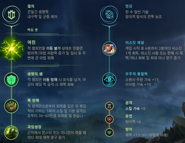 레오나는 E스킬로 적진으로 들어가는 일이 굉장히 많기 때문에 탱커용 룬인 결의의 여진을 찍어줍니다. 또 하위 룬으로는 2:2에서 좋은 생명의 샘, 순간 탱킹력이 올라가는 뼈 방패, 무난하게 성장할 수 있는 과잉성장 룬이 좋습니다. 보조 룬으로는 주로 영감 룬을 사용하는데요, 보통 비스킷 배달과 우주적 통찰력을 들어 라인 유지력과 쿨타임 감소에 신경을 씁니다.