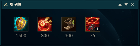 첫 귀환에서의 선택지는 많지 않은데요, 굉장히 성공해서 돈이 1500골드 이상이라면 군단의 방패를 구매해주시는게 좋고, 그 이하라면 천 갑옷과 마법무효와 망토, 신발, 루비수정을 상황에 맞게 가주시면 되겠습니다. 돈이 75골드 이상 남으면 무조건 제어와드를 구매해서 아군 정글러가 갱킹을 올 수 있는 루트를 확보해주고 상대방 갱킹을 방해해주시면 되겠습니다.