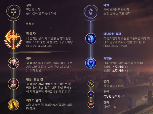 원딜 이즈리얼은 정밀의 정복자를 주로 들어줍니다. 평타와 스킬을 적절히 섞어주는 챔피언이기 때문에 정복자 스택을 빠르게 쌓을 수 있을 뿐더러 이렇게 스택을 쌓아 오르는 추가 AD만으로 정복자를 들 메리트는 충분합니다. 하위 룬으로는 마나 수급을 위한 침착과 조금이라도 생명력 흡수 효과를 보기 위한 전설: 핏빛 길, 그리고 딜링을 조금이라도 올려주는 최후의 일격을 많이 사용합니다. 보조 룬에는 우주적 통찰력에서 스킬 가속이 삭제된 이후 마법 룬에서 마나 관리에 도움을 주고 마나무네 효율을 높여주는 마나 순환 팔찌와 스킬 가속을 제공하는 깨달음을 골라주시면 되겠습니다.