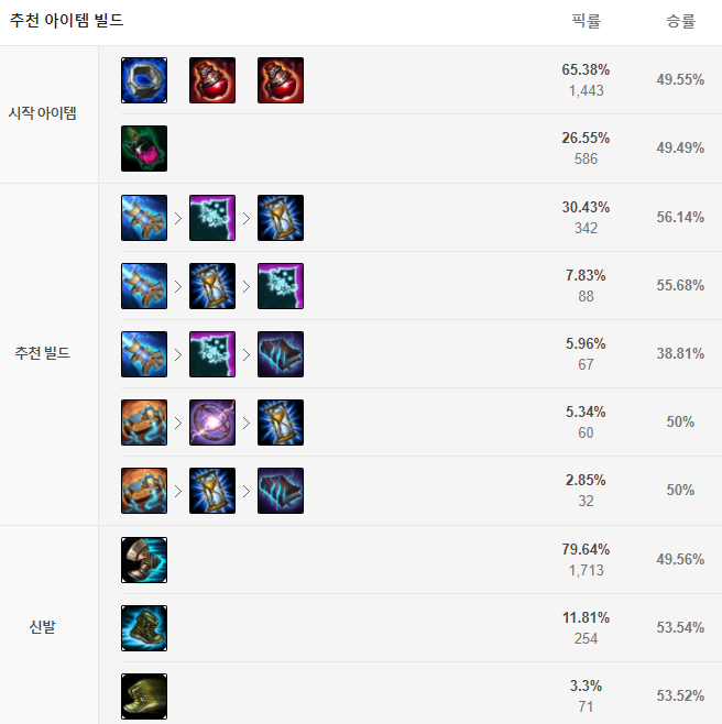 게다가 시즌10에서는 그렇게 높은 성능을 보여주는 챔피언도 아니고 E스킬을 잘 맞춰야할뿐만 아니라 룬에도 빙결강화 룬을 들고 GLP와 쌍둥이 그림자, 존야의 모래시계 등 액티브 아이템들을 사용하는데 익숙해야 충분히 효율을 뽑아낼 수 있죠.