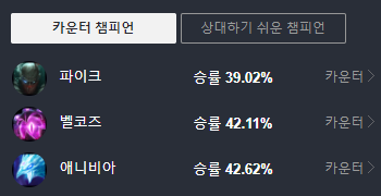 op.gg의 데이터에 의하면 니코의 카운터 챔피언은 파이크, 벨코즈, 애니비아로 되어 있는데 사실 얘네들 말고도 다른 AD챔피언들이나 피즈, 르블랑같이 순식간에 폭딜을 내는 챔피언들에게 약한 모습을 보여주는 걸 알 수 있습니다.
