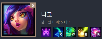 니코는 패시브 스킬을 이용하여 상대방이 니코라고 예상 못할때 E스킬을 맞추고 Q스킬을 맞춰서 딜링을 할 수 있고 W스킬을 이용해 적의 스킬을 먼저 한두개 빼고 시작할 수도 있는 챔피언입니다.