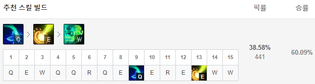 3레벨에는 W스킬을 찍고 그 이후부터는 R-Q-E-W 순서로 스킬을 마스터해주면 되겠습니다.