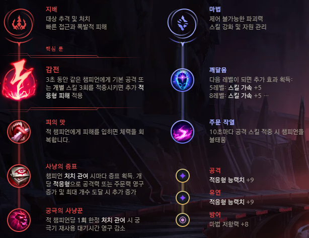 제드는 지배의 감전 룬을 핵심으로 사용합니다. 하위 룬으로는 라인 유지력을 높여주는 피의 맛, 챔피언 처치에 기여할수록 공격력을 제공해주는 사냥의 증표, 그리고 제드는 궁극기 의존도가 상당히 높기 때문에 궁극기 쿨타임 감소를 위한 궁극의 사냥꾼을 들어줍니다. 보조 룬은 보통 마법에 깨달음과 주문 작열을 들어서 쿨감과 더불어 초반 견제력을 높여주는 전략을 택합니다.