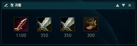 첫 귀환시 모인 돈에 따라 가는 아이템이 다양하지만, 귀환시 1050골드 이상이 모였다면 첫 아이템으로 간 롱소드를 톱날 단검으로 업그레이드 및 장화를 구입해주시면 되겠습니다. 750골드 이상 1050골드 미만인 경우 톱날 단검을 구매해주시면 되고 750골드 미만이라면 롱소드와 신발을 하나씩 구매해주시면 되겠죠? 그 돈도 안된다면 그냥 롱소드 하나를 더 구매하는 것을 추천드립니다.