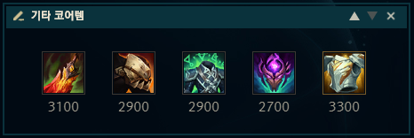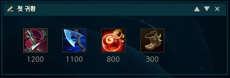 첫 귀환에서 돈이 1200골드가 넘으면 강철가시 채찍을, 1100골드 이상 1200골드 미만인 경우 온기가 필요한 자의 도끼를 띄워주시면 되겠습니다. 만약 두 아이템 다 못사는 경우에는 해당 아이템들의 하위템인 곡괭이나 단검, 롱소드를 적절하게 올려주시면 되구요. 상대 견제가 빡쎄다면 점화석을 먼저 올려주셔도 되고, 티모같이 사거리가 중요한 챔피언인 경우 장화를 구입하는것도 좋은 방법입니다.