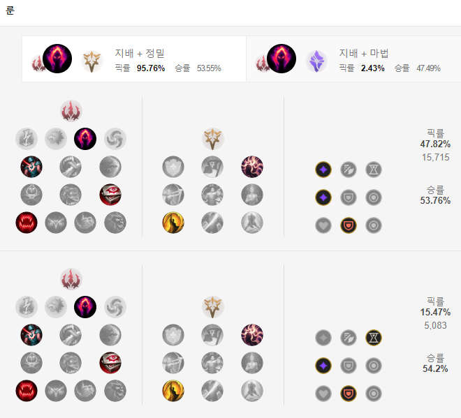 보조 룬에는 정밀을 들어 처치관여시 최대 마나량을 상승시켜줄 수 있게 하고, 최후의 일격을 들어서 적이 피가 없을 때 궁극기로 더 확실한 킬캐치를 노릴 수 있습니다.