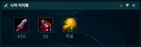처음 시작 아이템은 대부분의 원딜 공통 시작템인 도란의 검을 가줍니다. 도란의 검은 공격력과 더불아 모든 피해 흡혈 능력치를 제공하기 때문에 가성비가 상당히 좋은 아이템이죠. 도란검과 포션, 와드 토템으로 보통 시작합니다.