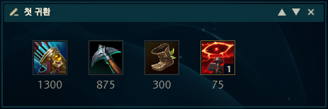 첫 귀환에서는 크라켄 학살자의 하위 아이템인 절정의 화살이나 곡괭이를 먼저 올려주시면 됩니다. 돈이 1300골드까지 안모이고 1175골드 이상이 모였다면 곡괭이와 신발을 가주시면 되겠죠? 돈이 남으면 제어 와드도 하나 사오면 아군 갱킹이 수월하게 할 수 있고, 반대로 상대 갱킹도 막을 수 있죠.