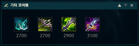 기타 코어 아이템으로 추천드리는 것은 유령 무희, 필멸자의 운명, 헤르메스의 시미터, 맬모셔스의 아귀 아이템입니다. 유령 무희의 경우 이동 속도 상승 옵션은 상당히 도움이 되고, 또 5회 공격 시 공격 속도가 추가로 올라가는 점은 베인이 한타를 쓸어담을 수 있게끔 해주죠. 필멸자의 운명같은 아이템은 치유 감소 아이템으로 상대 팀에 회복, 흡혈 능력이 강한 챔피언들이 많을 때 올려주시면 적절하며, 상대팀에 하드 CC기가 여럿 있다면 헤르메스의 시미터도 좋은 선택입니다. 또 상대 AP 딜러들이 잘 크고 포킹이 너무 빡쎄다면 맬모셔스의 아귀 아이템을 올려서 버티는 것도 좋은 선택이죠.