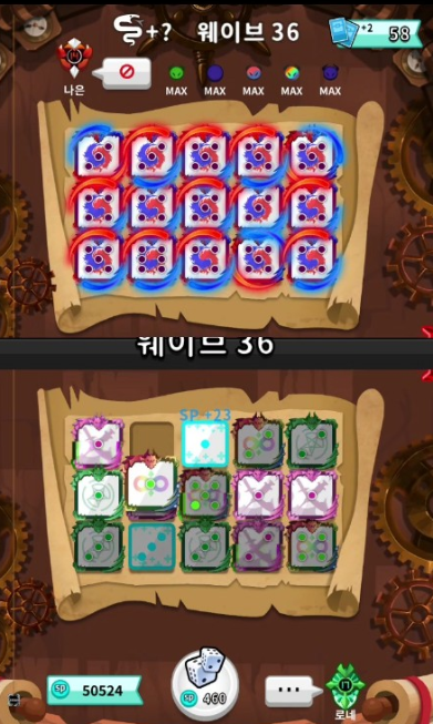 나이트 보스가 끝난 다음 다시 빠르게 광산 주사위로 필드를 채워주며 SP를 모아주시면 되는데요, 그렇게 라운드를 진행하다 25탄에 레온 보스가 등장합니다. 이 레온 보스는 필드 위 무작위 반 주사위들의 눈금을 하나씩 낮추는데요, 여기에서 또 다시 필드를 광산으로 매꿔주시면 됩니다.