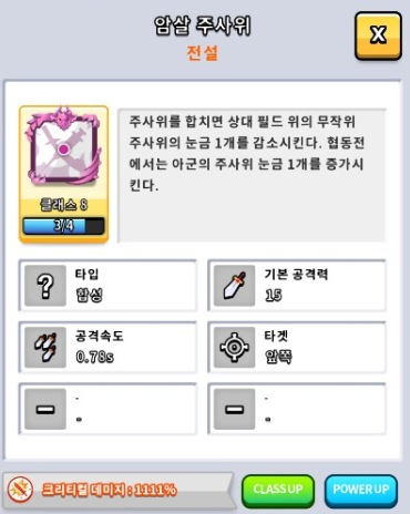 후반에 암살 주사위를 날리기 시작할 때는 그냥 막 날리는게 아니라 하나하나 뽑아가면서 조커 주사위를 암살 주사위로 복사해주시면서 쏴주시면 좋습니다. 최대한 많이 쏠 수 있게끔 쏘는게 좋죠. 예를 들어 위의 스크린 샷 같은 상황이라면 저는 우선 조커 주사위들을 다 암살 주사위로 복사해둔 뒤, 3성 소환 주사위 두개를 합쳐서 새로 생성된 주사위를 봅니다. 그게 적응 주사위나 조커 주사위, 암살 주사위인 경우 1성 암살 주사위를 합쳐서 하나 보내고, 또 새로운 주사위를 뽑겠죠. 만약 소환 주사위를 합쳐 나온 주사위가 소환 주사위인 경우 1성 소환 주사위와 한번 더 합쳐서 상황을 보고, 1성 광산 주사위라면 필드에 하나 남아있는 1성 광산 주사위 두개를 합치고 필드에 주사위를 하나 더 소환해서 상황을 봅니다. 이런 식으로 암살을 최대한 많이 쏴주는 쪽으로 하시면 더 좋습니다.