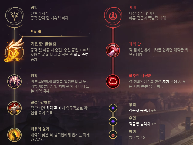시즌11, 프리시즌 아칼리의 룬은 시즌10과 마찬가지로 기민한 발놀림을 사용합니다. 주로 라인 유지력과 순간적인 기동력을 위해 사용하는데요, 하위 룬으로는 기력 챔피언을 위한 침착과 전설: 강인함, 최후의 일격을 들어주면 됩니다. 보조 룬으로는 지배의 피의 맛과 굶주린 사냥꾼을 들어 피흡 능력을 올려주는게 대부분입니다.