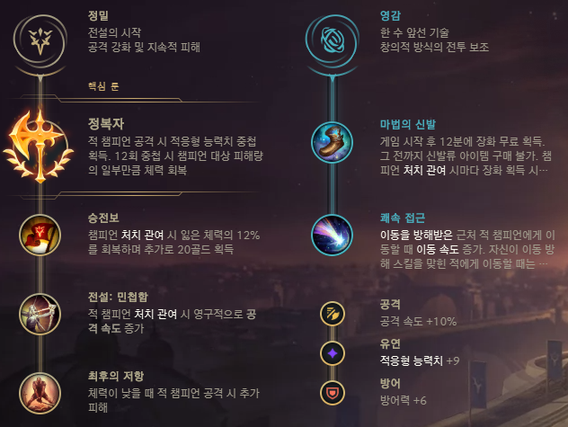 올라프의 주 룬은 정복자 룬입니다. 스택이 쌓일수록 공격력이 상승하는 효과도 좋고, 가한 피해의 15%만큼 회복하는 효과는 높은 수치의 흡혈과 회복량 증가 효과를 제공하는 스킬과 시너지를 일으키죠. 하위 룬은 승전보, 전설: 민첩함, 최후의 저항이 자주 사용됩니다. 보조 룬으로는 영감에의 마법의 신발과 쾌속 접근을 주로 채용합니다.