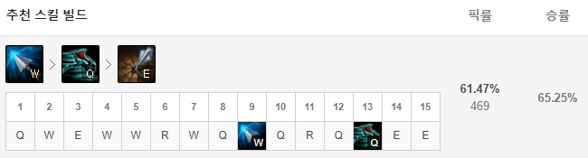 1레벨에는 Q를 찍고, 2레벨에는 W, 3레벨에는 E를 찍어준 뒤 4렙부터는 R-W-Q-E순서로 스킬을 마스터해주면 됩니다.
