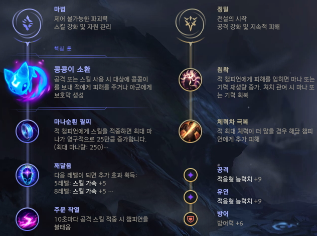 유미의 룬은 주로 마법에 콩콩이 소환, 마나순환 팔찌, 깨달음, 주문 작열을 들어주는게 좋습니다. 초중반에는 높은 마나소모를 어느정도 커버해주는 마나순환 팔찌와 부족한 견제력을 높이는 콩콩이, 주문작열, 스킬 쿨 감소를 위한 깨달음 룬이죠. 보조룬으로는 보통 킬관여시 마나 회복에 도움이 되는 침착과 최대 체력이 굉장히 낮은 유미에게 체력차 극복은 굉장히 잘 어울리는 룬이죠.