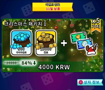 크리스마스 장식품를 모으는 이벤트인데요, 장신구를 계속 모으다 보면 그에 맞는 여러 보상들을 획득할 수 있습니다. 보상들중에는 전설 주사위인 별 주사위를 주기도 하고, 마지막 보상은 왕의 유산을 주니 초보 분들은 참여만 해도 전설 주사위를 두 개나 얻을 수 있습니다.
