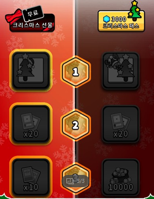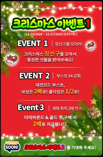 우선 크리스마스 이벤트1 이라고 적혀있는데다가 아래에 크리스마스 이벤트2를 기대해 주세요!라는 문구도 있어서 추후 추가적으로 새로운 이벤트가 나올 예정이겠습니다. 일단 현재 진행중인 이벤트는 크게 세 가지로 나뉩니다.