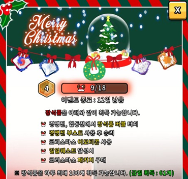 또 크리스마스 이벤트로 얻을 수 있는 첫 보상인 크리스마스 이모티콘을 게임 내에서 사용하면 한 판당 1회 장식품을 얻을 수 있죠. 또 일일 퀘스트를 수행해도 장식품을 얻을 수 있으며, 크리스마스 패키지를 구입하는 방법으로도 장식품을 획득할 수 있습니다.