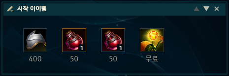시작은 강철 어깨 보호대입니다. 몸이 약하지만 근접전을 자주 하는 쓰레쉬에게 적당한 탱킹을 보장해주는 아이템이죠. 강철 어깨 보호대와 더불어 포션 2개, 와드 토템으로 시작해주시면 되겠습니다.