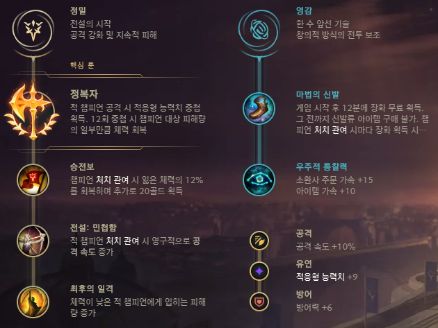 리신의 룬은 주로 정밀의 정복자를 선택합니다. 리신의 딜링 시스템이 스킬과 평타를 많이 섞기 때문에 정복자 스택을 쌓기 쉽기 때문이죠. 정복자가 제공하는 적응형 능력치와 흡혈 모두 리신의 전투 지속련을 보완해주기에 정복자를 듭니다. 하위 룬으로는 승전보와 전설: 민첩함, 최후의 일격을 들어주는게 좋고 그 외에 보조 룬에는 마법의 신발과 우주정 통찰력을 드는 추세입니다.