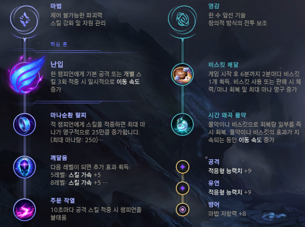 신드라의 룬은 주로 마법 룬의 난입을 들어줍니다. 무빙을 하면서 스킬을 사용하는 신드라와 효율이 잘 맞으며 하위 룬의 경우 마나순환 팔찌, 깨달음, 주문 작열을 들어 라인전 마나, 스킬 가속, 추가 딜링을 올려주는 역할을 합니다. 보조 룬으로는 영감의 비스킷 배달과 시간 왜곡 물약을 들어 라인 유지력을 키워주고 이를 바탕으로 더 딜교를 열심히 할 수 있습니다.
