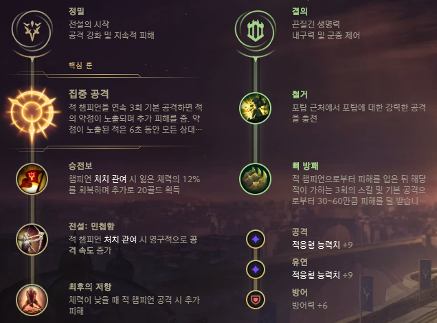 레넥톤의 주 룬은 정밀의 집중 공격이 사용되는데요, 가끔씩은 정복자 룬을 들기도 합니다. 집중 공격의 경우 초반 라인전에서 확실하게 이겨 상대를 박살내려는 것이고, 정복자의 경우는 중반 이후 1:2 구도 및 한타 기여도를 높이는 선택이죠. 집중 공격은 평타 - W 또는 강화 W만으로 집중 공격을 손쉽게 터뜨릴 수 있어서 순간적으로 폭딜을 넣을 수 있어서 좋죠. 하위 룬으로는 승전보와 전설: 민첩함, 최후의 저항을 들어주면 되며 보조 룬으로는 철거와 뼈 방패가 가장 무난하게 사용되는 룬입니다.