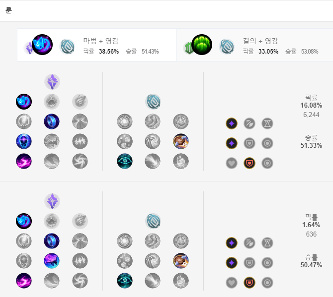 초반 마나 수급을 위한 마나순환 팔찌, 재사용 대기시간 감소되는 깨달음, 조금이라도 딜링능력을 극대화시켜 초반에 이득을 볼 수 있게끔 주문 작열을 찍어주시면 되고 영감 부분에는 비스킷과 통찰력을 들어주시는게 가장 무난한 룬 선택입니다.