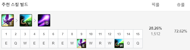 스킬같은 경우 1레벨에 E, 2레벨에는 Q, 3레벨에는 W를 찍어주시고 그 이후부터는 R-E-W-Q순으로 마스터를 해주는게 최근 유행하는 스킬 빌드입니다.