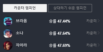 룰루의 카운터 챔피언으로는 브라움, 소나, 자이라가 통계에 잡혔는데요, 브라움의 경우에는 룰루의 공격을 대신 몸으로 받아내는데 브라움의 스킬때문에 데미지도 그렇게 많이 받지도 않으며 후반이 되면 될수록 물몸인 룰루와는 달리 서브탱커 역할을 독톡히 수행할 수 있기 때문에 후반에 차이가 나게 됩니다.