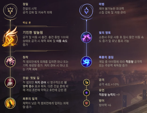 케이틀린 룬은 정밀 빌드의 기민함 발놀림을 주로 사용합니다. 기민한 발놀림은 케이틀린에게 있어서 거리 조절 및 라인 유지력에 큰 도움이 되죠. 하위 룬으로는 마나 수급을 위한 침착과 유지력을 더 올리는 전설: 핏빛 길, 체력이 일정 수준 이상 깎인 챔피언에게 가하는 피해량이 증가하는 최후의 일격을 보편적으로 들어줍니다. 보조 룬에는 마법에 소환수 주문의 활용을 높일 수 있는 빛의 망토와 후반으로 가면 갈수록 강해지는 폭풍의 결집 룬을 선택하는 편입니다.